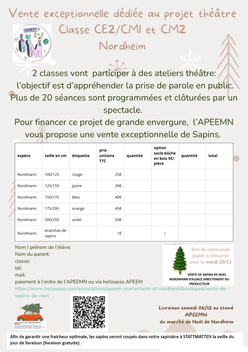 En pièce jointe, vous trouverez le flyer pour la vente de sapins. Les bénéfices permettront de financer les projets de l'école (projet théâtre des classes de CE2/CM1 et CM2).